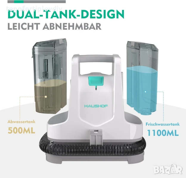 Двоен резервоар за вода: подвижен резервоар за вода за лесно пълнене и изпразване. Системата с двоен резервоар позволява почистване с чиста вода, като същевременно съхранява мръсотията и праха отделно. Резервоар за чиста вода: 1100 мл, резервоар за мръсна вода: 500 мл.