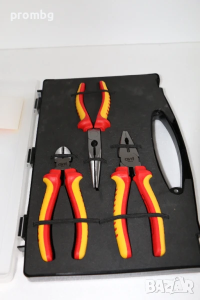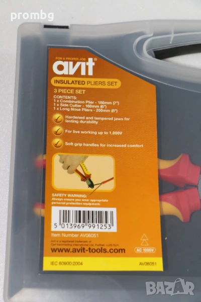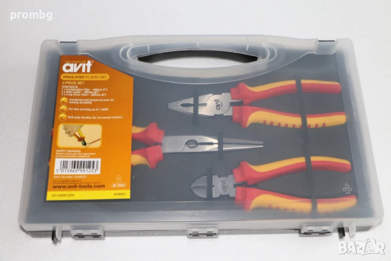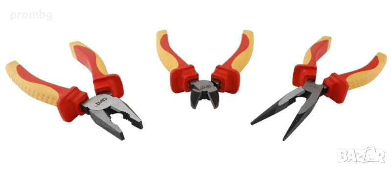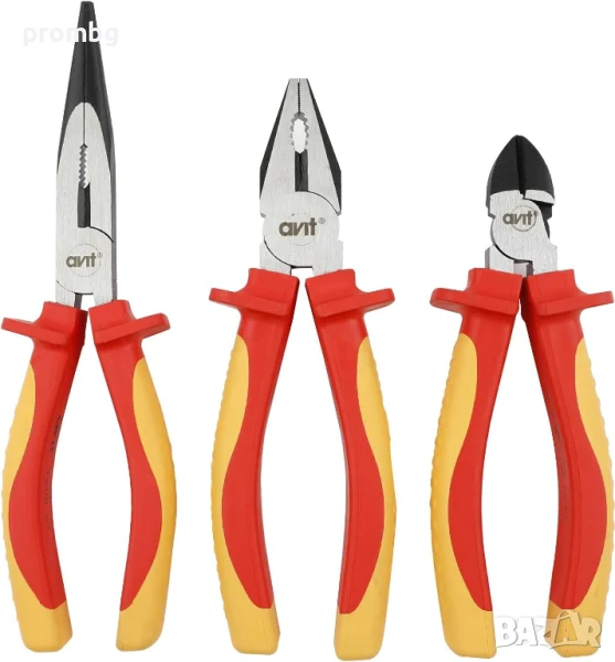 комплект нови клещи 1000 V, 3 бр, внос от Германия, AVIT - Англия. Изработени от закалена стомана, с ергономични дръжки. Комплектът се състои от: клещи с дълги челюсти 200 мм 8", клещи секачки 160 мм 6", комбинирани/универсални/ клещи 180 мм 7".