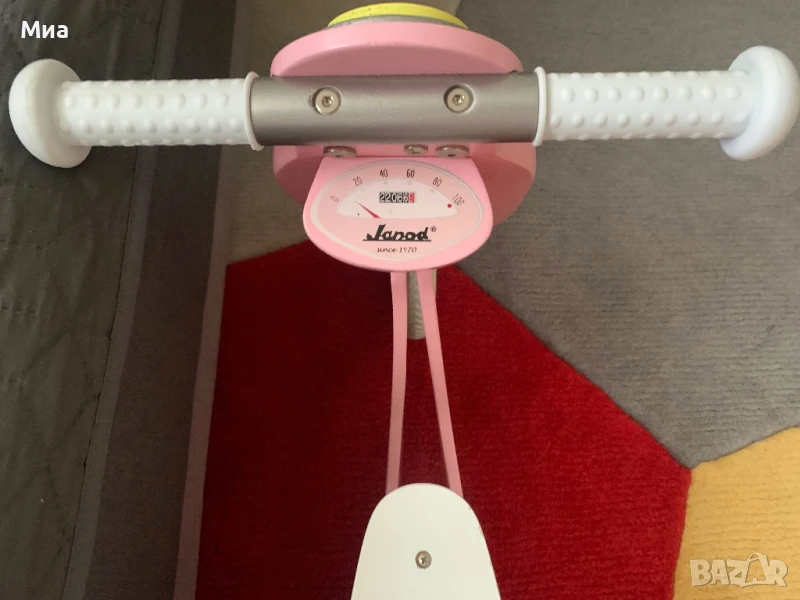 Janod Розов скутер за баланс е снабдено със сваляща се чанта благодарение на система за залепване с велкро. Вашата малка дама може да носи своята пухкава играчка навсякъде със себе си, да вмъкне закуската си и да съхранява всички открития, направени по време на експедицията си.
