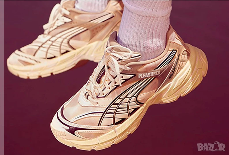 Този изцяло кремав силует на Velophasis на Puma е създаден в сътрудничество с Pleasures. Той е вдъхновен от стила на 2000-те и традиционната серия спортни маратонки на Puma, преосмислени, за да създадат нещо ново и автентично.