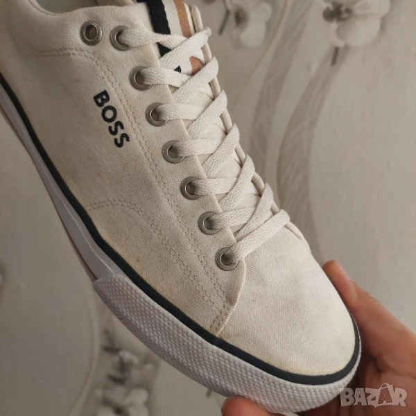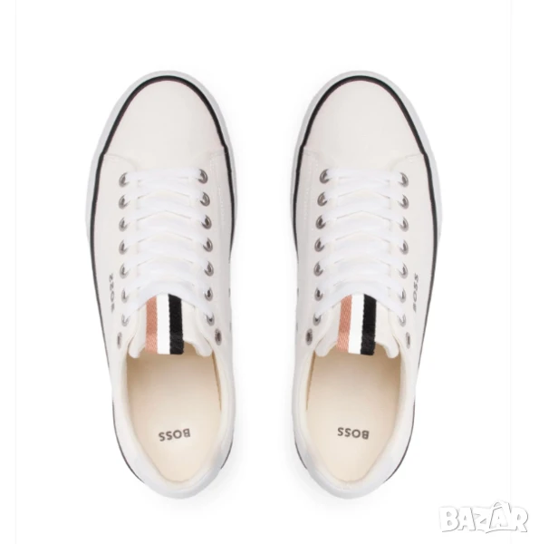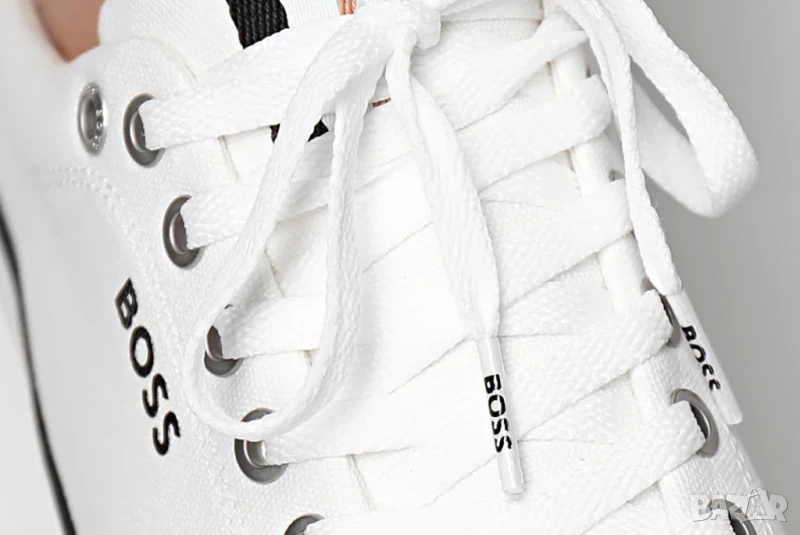 Класически маратонки с нисък профил от BOSS. С контрастно лого отстрани, тези маратонки с връзки са изработени от горна част от памучен плат и са поставени върху вулканизирана гумена подметка. Логото BOSS и характерната райета придават на тези обувки отличителен щрих.