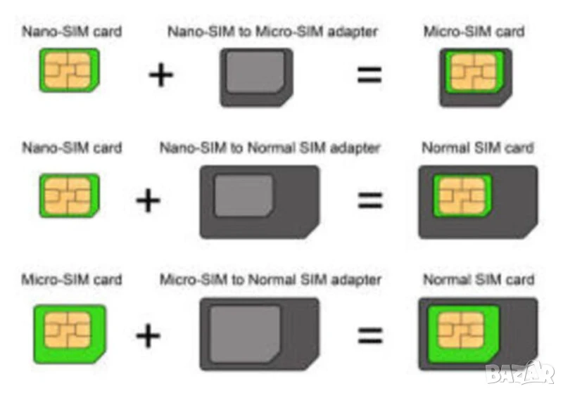 Безпроблемно ползване на форматираната SIM карта в различни мобилни апарати, използващи трите стандарта, директно или чрез увеличителен адаптор (вижте обява). Съвместим с всички СИМ карти на мобилни устройства - GSM мобилен и сателитен телефон смартфон iOS iPhone Айфон и Android Андроид, iPad, Таблет и др.
