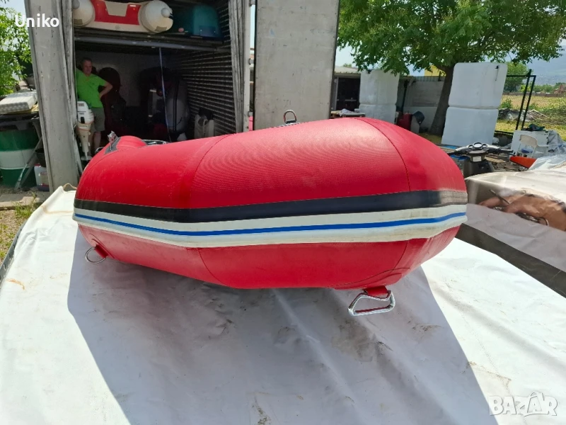 Здрава лодка без лепенки и протривания. Лодката е с V-образно надуваемо дъно, подсилено с нишки от полиестерни влакна. Продава се със седалка, носова чанта (сак), транцеви колела и 💥 една каса бира!