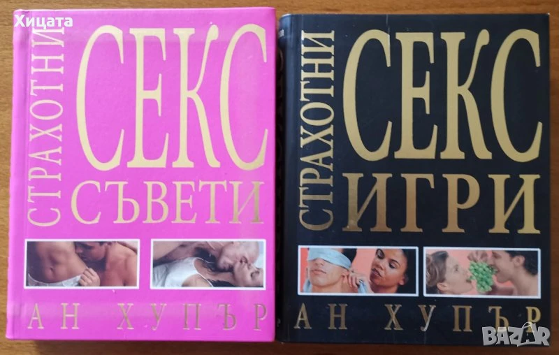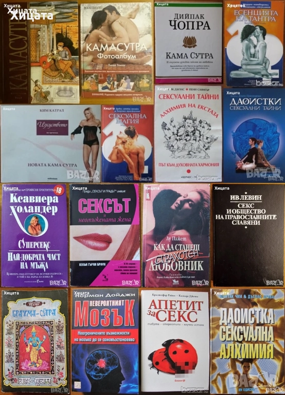 Апетит за секс:табута,стереотипи,научни истини,Кристофър Райън,Касилда Джета,БГ Книга,2014г.418стр. - 95лв Супер секс:Най-добрата част на мъжа,Ксавиера Холандер,Бард,2003г.414стр.Отлична!- 80лв.Изкуството на оргазма. Новата кама сутра, Ким Катрал, Милениум, 2008г.144стр. - 100лв. Сексуална магия. Древни любовни техники за вътрешна трансформация, Марго Ананд, Шамбала, 2003г.538стр. - 125лв. Кама Сутра и седемте духовни закона на любовта, Дийпак Чопра, Бард, 2008г.160стр. Нова- 130лв. Камасутра. Фотоалбум, Линда Зонтаг,Booktrading,2001г.128стр. - 100лв. Как да станеш страхотен любовник, Лу Пажет, Кибея, 2003г.256стр. - 80лв. Даоистка сексуална алхимия,Мантак Чиа, Дъглас Арава,Одисей,1999г.324стр.- 80лв. Сексуални тайни. Алхимия на екстаза. Път към духовната хармония, Ник Дъглас, Пени Слингър, Хермес-7,1993г.372стр. - 40лв; Даоистки сексуални тайни, Дзиен Цетнерсан, - 60лв; Есенцията на Тантра. Модерен пътеводител в свещената сексуалност, Кенет Рей Стъбс, изд. Шамбала, 2001г.384стр. -120лв.Страхотни