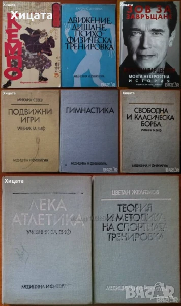 Тайните на полицейското айкидо, Бил Соса, Златорогъ, 1998г.160стр. - 60лв. Динамично Айкидо, Гозо Шиода, Златен Дракон, 2000г.200стр - 70лв. Айкидо и природната хармония, Мицуги Саотоме - 85лв. Айкидо и динамичната сфера. Илюстрирано въведение, А. Уестбрук, О. Рати, Златен Дракон, 1998г.368стр. - 90лв. Па Куа Джан. Бойната стратегия на осемте посоки, Дориян Александров, Загер, 1993г.252стр. -80лв. Тайните на моя успех. Професионално ръководство за мускулно развитие, Арнолд Шварценегер, ЕТ ”Генов - суперспорт”,1993г.240стр. -85лв. Волейбол. Учебник за студентите от ВИФ ”Георги Димитров”, Крумова, Медицина и физкултура, 1990г.232стр. - 60лв. Баскетбол. Учебник за студентите от НСА, Колектив под редакцията на Вл. Цветков, 2005г.316стр. Отличен с леки забележки! -70лв. Подвижни игри. Учебник за студентите от ВИФ, Михаил Севев, Медицина и физкултура, 1978г.278стр. - 90лв.. Гимнастика, Никола Хаджиев и др., Медицина и физкултура, 1979г.312стр. - 110лв. Свободна и класическа борба, Р. Петров, Д. Добрев, Н. Берберов, О. Макавеев, Медицина и физкултура, 1977г.352стр. - 150лв. Хандбал, Никола Кръстев, Медицина и физкултура, 1985г.232стр. - 80лв. Теория и методика на спортната тренировка, Цветан Желязков, Медицина и физкултура, 1981г.268стр. - 100лв. Лека атлетика. Учебник за ВИФ, Атанас Коларов, Медицина и физкултура, 1977г.352стр. - 100лв. Туризъм, алпинизъм и ориентиране, Г. Атанасов, И. Янакиев, М. Златанов, Г. Жълтов, Т. Джамбазов, К. Долапчиев, А. Николов, Медицина и физкултура, 1986г.286стр. - 70лв. Спортна стрелба, И. Ачкаканов, П. Атанасов, Медицина и физкултура, 1987г.132стр. - 150лв. Фитнес. Силова тренировка Венд-Уве Бьок Беренс, Волфганг Бускис, Унискорп, 2003г.464стр. - 90лв.АBC културизъм, М. Яблонски, Ал. Бачински, Б. Бокуш, Ю. Вишни, Медицина и физкултура, 1971г.212стр. - 30лв. Борба, Г. В. Гончаров, Н. Н. Сорокин, Физкултура, 1949г.208стр. - 50лв. Водно-моторен спорт. Учебно помагало за секциите по воден спорт, Ю. В. Емелянов, Р. Н. Шибаев, 1952г.212стр. - 65лв. Ефективна самозащита, Красимир Василев, Кота, 2003г.112стр. - 80лв. Да обучим бодигард, Маноил Манев, Арос, 2014г.272стр. Леко замърсено горно дясно ъгълче. Безпроблемно четене! - 55лв. Енциклопедия на културизма. Културистични принципи и методи, Владимир Боянов, Труд2006г.340стр. - 100лв. Стратегия за мускулно развитие, Иван Дълбоков, Изд.SNC,2006г.240стр. -70лв. Зов за завръщане, Арнолд Шварценегер, Хермес, 2013г.592стр./528 + 64 стр./Отлична с посвещение! - 100лв.Кемпо.Традициите на японските бойни изкуства Александър А.Долин - 50лв. Движение,дишане,психофизическа тренировка,Каролис Динейка - 60лв.Револвери и пистолети.Универсален справочник,Александър Жук,Universe,1997г.354стр. - 120лв. Да се научим да стреляме точно,Никола Даскалов,Иван Симеонов,Труд,2001г.144стр. - 80лв.Културизъм.Сила,хармония,симетрия,Владимир Боянов,1994г.200стр. - 40лв. Мускулен транс.Културизъм за маниаци,Еню Рангелов,Ласка,1994г.152стр. - 50лв. Туризъм, алпинизъм и ориентиране,Г.Атанасов,И.Янакиев,М.Златанов,Г.Жълтов,Т.Джамбазов,К.Долапчиев,А.Николов,Медицина и физкултура,1986г.286стр. - 70лв Техника на планинското спасяване,П.,Москов,БЧК,1976г.220стр.Запазена,петна на няколко страници.Безпроблемно четене. - 40лв Каланетика,Калан Пинкни - 30лв