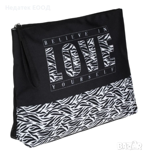 Лятна платнена чантичка за тоалетни принадлежности, черна със зебров мотив от едната страна и черна от другата с надпис "LOVE Believe in yourself". Има цип, вътрешен малък джоб и черна дръжка. В нея могат да се съхраняват мобилен телефон, ключове, очила и лични вещи.