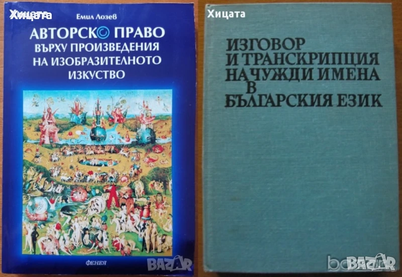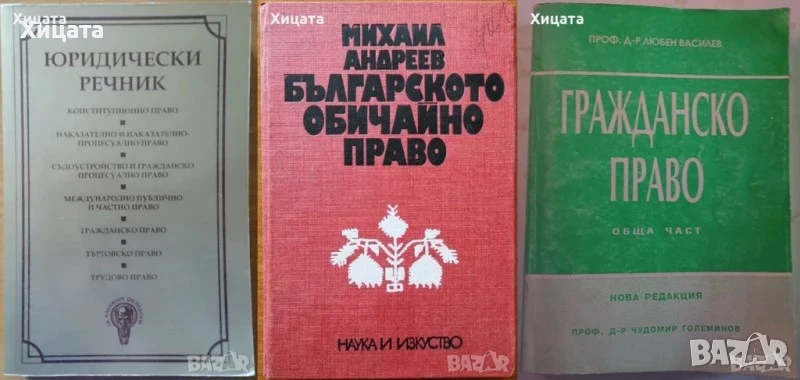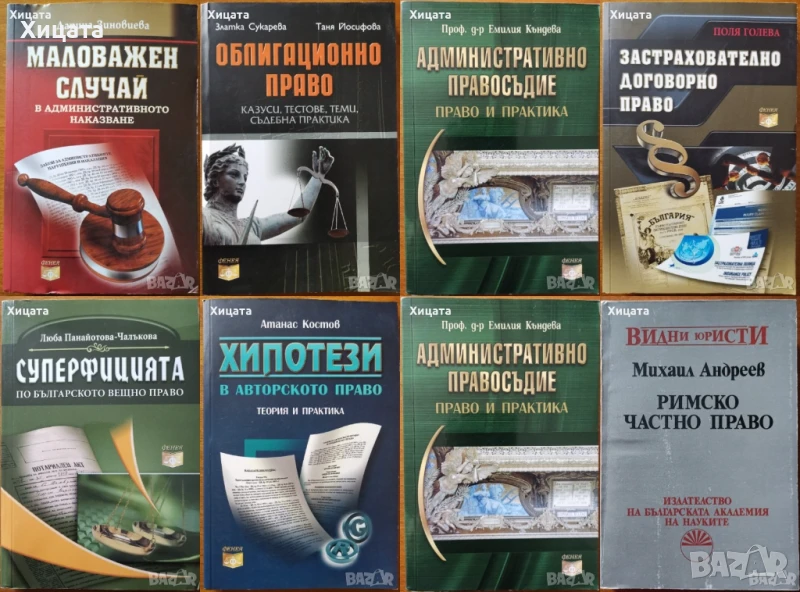 Суперфицията по българското вещно право,Люба Панайотова-Чалъкова,Фенея,2009г.296стр.Отлична! - 120лв.Административно правосъдие.Право и практика,Емилия Къндева,Фенея,2013г.544стр.Отлична! - 140лв. Маловажен случай в административното наказване.Коментари и съдебна практика,Дарина Зиновиева,Фенея,2011г.396стр.Отлична с леки забележки! - 130лв. Хипотези в авторското право.Теория и практика,Атанас Костов,Фенея,2010г.228стр.Отлична! - 80лв. Облигационно право,Казуси,тестове,теми,съдебна практика,Златка Сукарева,Таня Йосифова,Фенея,2011г.368стр.Отлична! - 110лв. Застрахователно и договорно право,Поля Голева,Фенея,2012г.404стр.Отлична! - 120лв. Римско частно право,Михаил Андреев,БАН,1992г.470стр.Отлична! - 50лв. Българското обичайно право,Михаил Андреев,Наука и изкуство,1979г.324стр.Отлична! - 70лв. Гражданско право.Обща част,Проф.Д-р Любен Василев.Нова редакция Проф.Д-п Чудомир Големинов,ТедИна,1993г.432стр. - 50лв Послеписът на Харт.Коментари върху послеписа на Харт към понятието за право,41Т ЕООД,2006г.440стр.Отлична! - 40лв Юридически речник,Георги Георгиев,Любен Велинов,УИ "Св. Климент Охридски",2007г.446стр.Отличен! - 60лв Авторско право върху произведения на изобразителното изкуство,Емил Лозев,Фенея,2010г.372стр.Отлична с леки забележки! - 100лв.Изговор и транскрипция на чужди имена в българския език,Колектив,Наука и изкуство,1974г.488стр. - 25лв