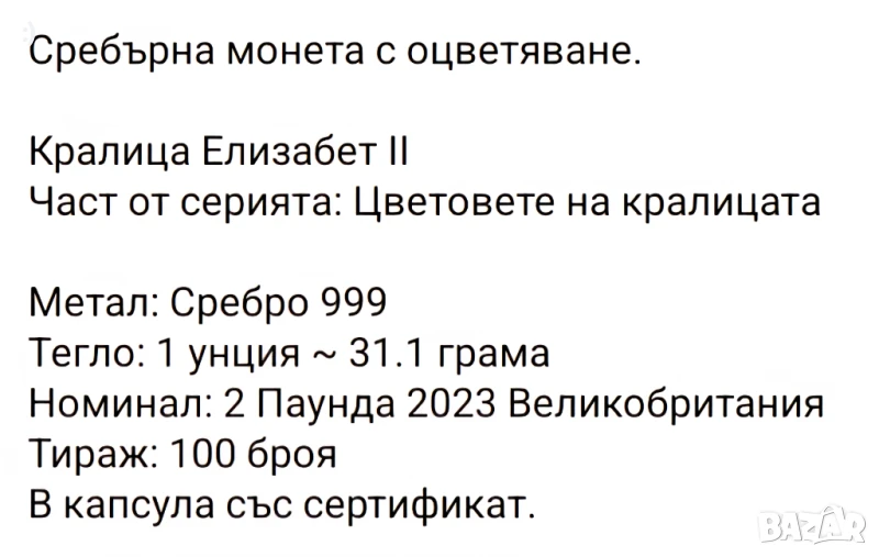 Тази тържествена сребърна монета от 1 унция отдава почит на тъжната кончина на кралица Елизабет II, една година след смъртта й, в памет на най-дълго управлявалия монарх в британската история. Монетата има много отличителен дизайн, интензивно оцветяване и се предлага в кутия, заедно със сертификат за автентичност. Лимитирана серия от 100 броя за целия свят.
