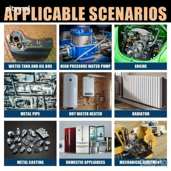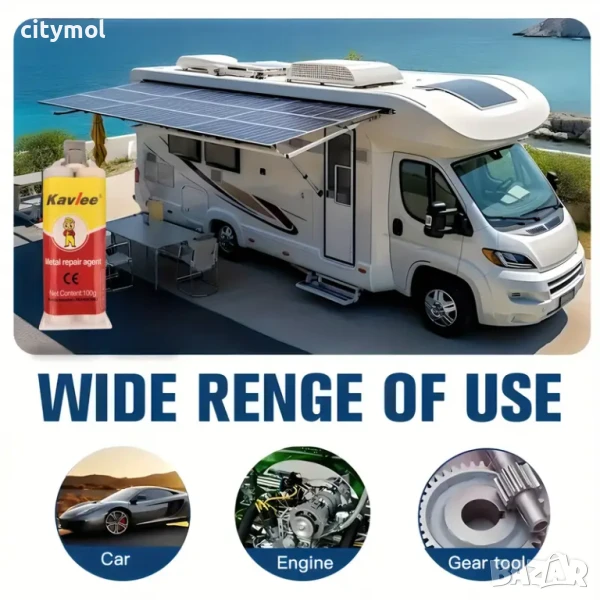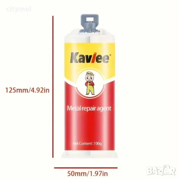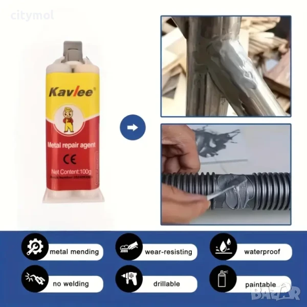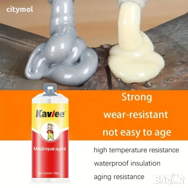 Двукомпонентно лепило за ремонт на метал и пластмаса. Бързо и надеждно лепи части от всякакви метали и сплави (стомана, чугун, алуминий, мед, месинг, бронз, магнезий, калай, олово и др.) във всякаква комбинация. Идеален за бързи ремонти с дългосрочен ефект, например: за запечатване на пукнатини и кухини на повърхности с всякаква форма, възстановяване на повредени резби, както вътрешни, така и външни. Може да се използва както при ремонт на автомобили и друга техника, така и в промишлеността, у дома и в офиса. Втвърдява се в рамките на минути. Окончателното втвърдяване се извършва в рамките на 24 часа, съединението придобива висока механична якост на срязване (3-5 N / mm²) и може да издържи на температури от - 60 до +200 ° C.