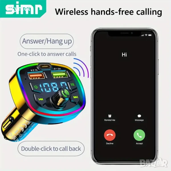 Висококачествен FM трансмитер за автомобил. Поддържа MP3 и WMA формат. Възпроизвеждане на музика от флашка и Bluetooth. Зареждане на външни устройства чрез 2xUSB и Type C портове.