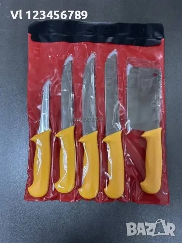 Комплект професионални месарски ножове 5 броя, подходящи за транжиране, рязане на зеленчуци, месо и други. Изработени от инструментална неръждаема стомана с тройно заточено острие. Подходящи за професионална употреба.