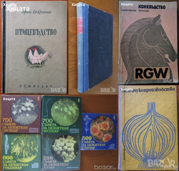 Коневъдство,Р. Караиванов,Земиздат,1973г.212стр.Подчертан текст на места. - 100лв.Птицевъдство(С болести по птиците), Проф. Борис Куманов, 1948г.336стр. Изключително запазена! - 180лв. Птицевъдство, Проф. Ст. Куманов, Земиздат, 1952г.282стр. Изключително запазена с подчертан на места текст! - 150лв.700 съвета за любителя овощар, Виденов, Ковачев, Манов, Земиздат, 1977г.420стр. - 65лв. 700 съвета за любителя овощар, Виденов, Ковачев, Манов, Земиздат, 1984г.396стр. - 65лв. 666 съвета за любителя градинар, Алипиева, Василева, Земиздат, 1982г.300стр. - 65лв. Зеленчукопроизводство,Генко Генков,Тодор Муртазов,Илия Минков,Земиздат,1974г.562стр. - 70лв Ръководство по рибарство (Риболовство и Рибовъдство),Грозю Ив.Грозев,Специалист по рибарството,Печатница Военно-издателски фонд,1947г.176стр.Изключително запазена! - 100лв. Орехоплодни култури,Недю Недев и др.Христо Г. Данов,1983г.364стр.Отлична със забележки по обложката! - 50лв.