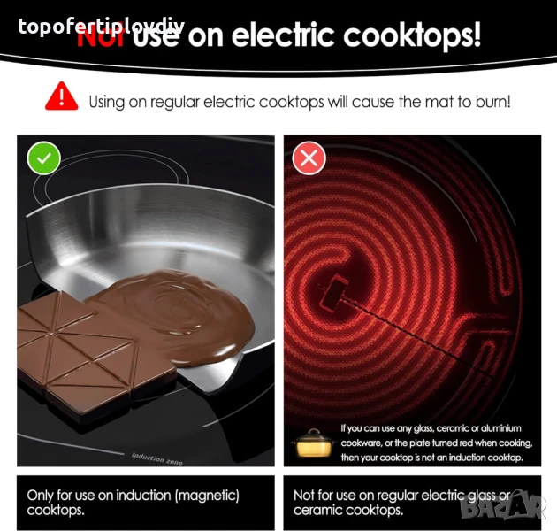 Предупреждение: не е за употреба върху обикновени електрически стъклокерамични или керамични котлони, само за употреба върху индукционни котлони (магнитни). Не излагайте на температури над 450℉.