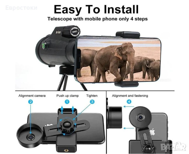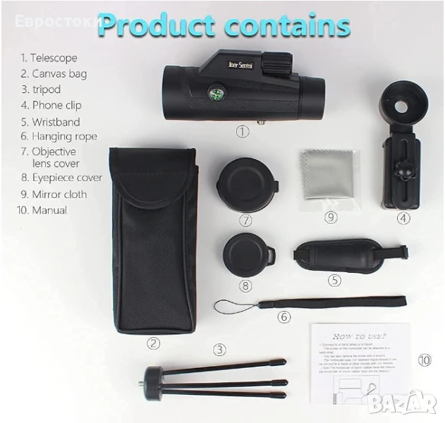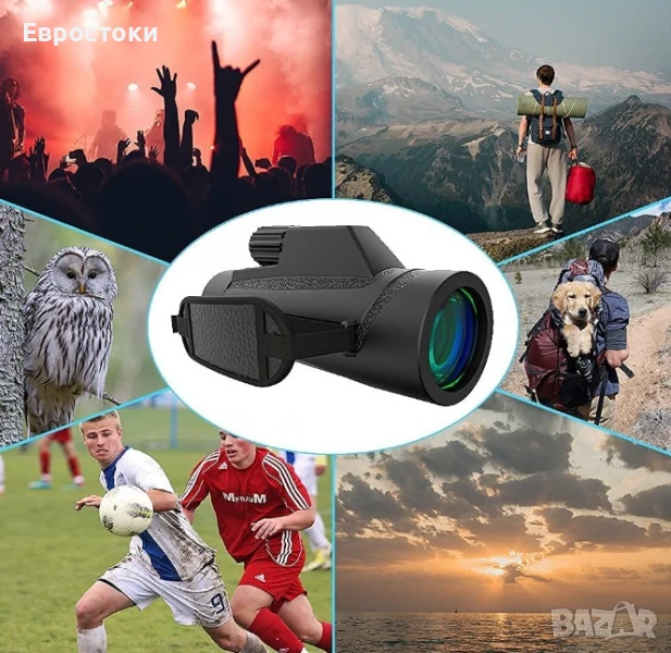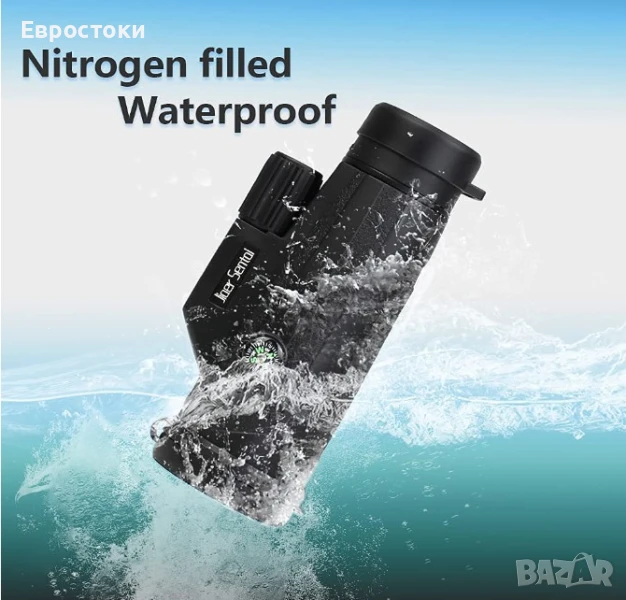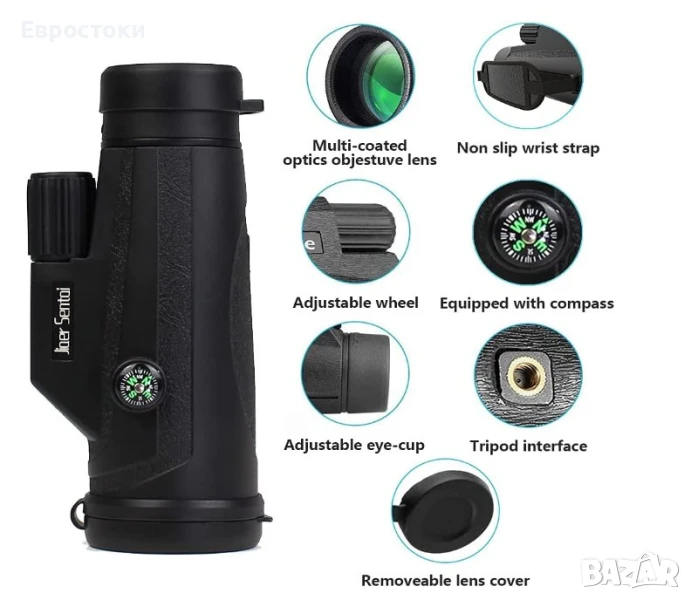 Многофункционален монокулярен телескоп. Уникалният дизайн включва компас и каишка за ръка. Много е удобен за държане и фокусиране с една ръка. Перфектен за туризъм, лов, катерене, наблюдение на птици, игри с топка, концерти, наблюдение на диви животни и пейзажи.