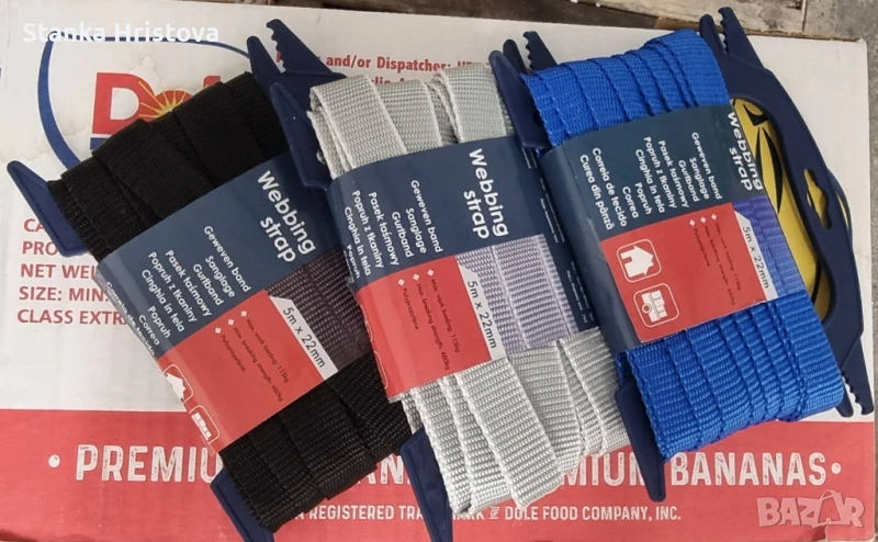 Продавам чисто нова Пропиленова лента 5m×22mm. Максимално работно натоварване 115кг, максималната якост на скъсване 400кг. С лентите може да си изработите колани, столове , поводи за кучета, за каишки на раници и др. Внос от Германия. Цената е за брой.