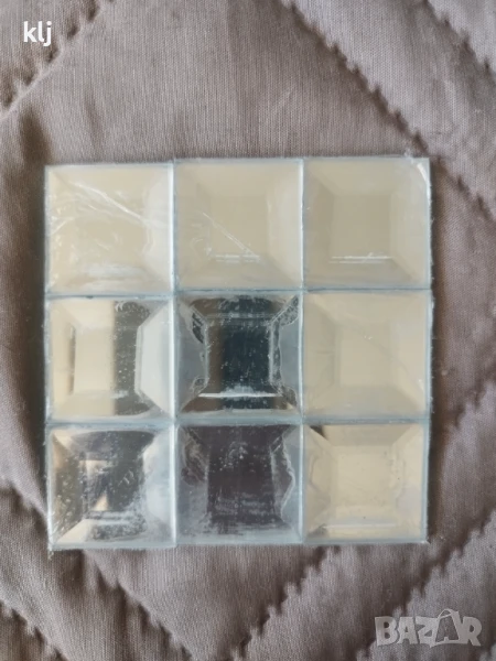 Огледални плочки за декорация размера е 9×9 см,всяко квадратче на самата плочка е с размер 3×3 см,и е фасет цената от 9 евро е за плочка с размери 9×9 см
