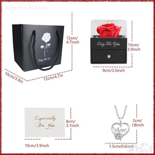 - Кутия за колие „Вечна истинска роза“ - Пакетът се предлага с изящно колие във формата на сърце с прозрачен кубичен цирконий, зашеметяваща кутия за показване с истинска консервирана роза, сладка поздравителна картичка (можете сами да попълните), многофункционална кутия за показване, както и луксозна подаръчна торбичка. Можете да подарите директно, без да губите време за опаковане. Страхотни празнични подаръци за жени.