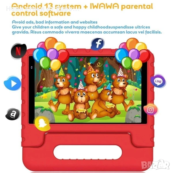 таблет YESTEL с WiFi 6, Android 13, 7GB RAM + 64GB ROM (1TB TF), учебен таблет 8" HD IPS дисплей 1280*800, удароустойчив EVA калъф за безопасност на деца, червен