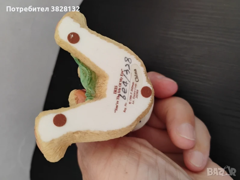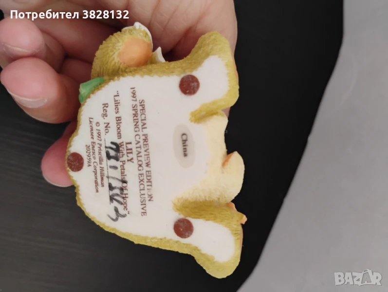 снимки 1-5: колекционерска фигурка Cherished Teddies "Lily" от 1997 г., произведена от Enesco Corporation. Фигурката е наречена "Lily" и е част от "Special Preview Edition", ексклузивна за пролетния каталог от 1997 г. На основата на фигурката е изписан цитатът "Lilies Bloom With Petals Of Hope" (Лилиите цъфтят с листенца надежда).Дизайнът е дело на Присила Хилман, а производството е на Enesco Corporation. Маркирана. Изработена е от смола.Произведена е в Китай.Цена 60лв. снимки 6-10:фигурка от колекцията "Cherished Teddies", озаглавена "IRIS "You're The Iris Of My Eye"". "Cherished Teddies" е колекция от фигурки на