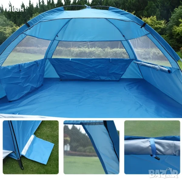 Палатка за плаж. Слънцезащитна. Лесна за монтаж, външна къмпинг палатка. Риболовна палатка с разширяема врата и 3 мрежести прозорци, с 4 джоба за пясък.