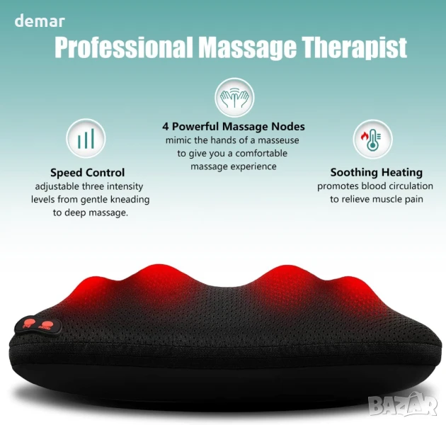 Тази възглавница за дълбок масаж разполага с четири 3D възела, които се адаптират към контурите на тялото ви, предлагайки ефективно облекчаване на стреса и умората с опционална успокояваща топлина. Изработена от издръжливи, дишащи и щадящи кожата материали, тя включва екологично чист калъф за намаляване на триенето и прегряването. Подходяща за употреба върху врата, гърба, раменете, корема, бедрата и прасците, тя е идеална както за дома, така и за офиса. Удобният за потребителя дизайн предлага лесно управление, обратимо движение и избор на топлина. Лека и преносима, тя е и чудесен подарък за всеки повод.