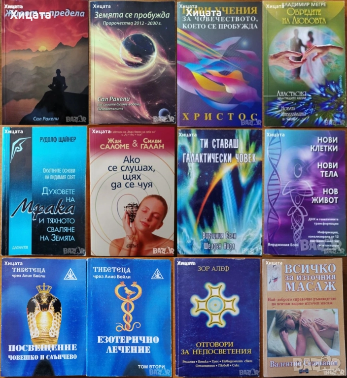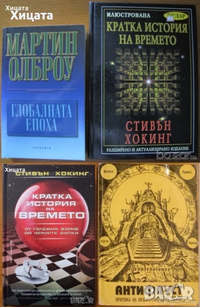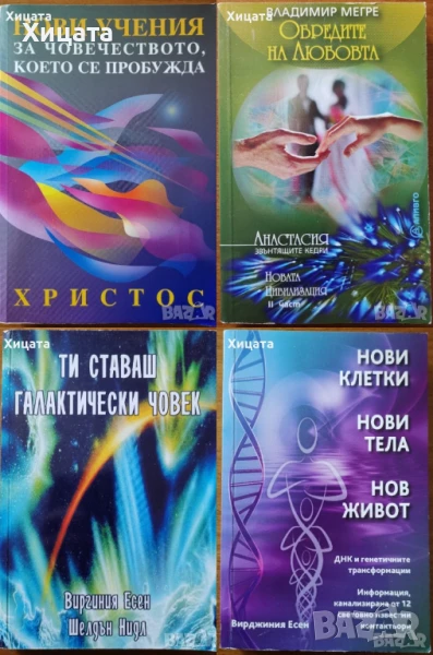 Илюстрована кратка история на времето.Разширено и актуализирано издание,Стивън Хокинг,ИнфоДар,2004г.254стр. - 60лв.Кратка история на времето,Стивън Хокинг,Бард,2010г.288стр. - 20лв Глобалната епоха,Мартин Олброу,Обсидиан,2001г.368стр. -60лв. Confessiones.Том 2: Антифауст. Критика на мефистофелския разум Материус Розенкройцер,Омнисемантизъм,1993г.544стр.- 30лв.Ти ставаш галактически човек,Виргиния Есен,Шелдън Нидл,Квазар,2005г.336стр.Отлична! - 70лв. Нови клетки,нови тела,нов живот,Вирджиния Есен,Шамбала,2008г.344стр.Отлична! - 60лв. Новата цивилизация.Част 2:Обредите на любовта.Книга 8,Владимир Мегре,Алимго,2006г.248стр.Отлична! - 50лв. Нови учения за човечеството,което се пробужда,Вергиния Есен,Орбис–М,2002г.336стр.Отлична! - 70лв. Живот на предела,Сал Ракели,Възнесение,2013г.436стр. - 125лв. Земята се пробужда.Пророчества 2012-2030 г.,Сал Ракели,Възнесение,2012г.414стр. - 70лв.Духовете на Мрака и тяхното сваляне на Земята.Окултни основи на видимия свят,Рудолф Щайнер,Даскалов,1998г.304стр. - 75лв Ако се слушах,щях да се чуя,Жак Саломе,Силви Галан,Колибри,2016г.408стр.Нова! - 80лв Аз + Ти = Ние?,Жак Саломе,Колибри,2000г.256стр. - 70лв Тайното учение на Питагор:Гадаене с числа,Мириам,2008г.122стр. - 60лв Уелнес.Наръчник за добро здраве и пълноценен живот,Джон Травис, Реджина Сара Райън,Кръгозор,2011г.460стр.Отлична! - 70лв Езотерично лечение.Том 2,Тибетеца чрез Алис Бейли,Анхира,1999г.270стр. -70лв. Посвещение-човешко и слънчево,Тибетеца чрез Алис Бейли,Анхира,2000г.176стр. - 60лв.Отговори за непосветения,Зор Алеф,Анхира,2001г.368стр.С надпис и автограф от автора! - 95лв Всичко за източния масаж.Най-доброто справочно ръководство по всички видове източен масаж,Валентин Селиванов,Дилок,2006г.272стр. - 90лв Басни,Езоп,Захарий Стоянов,2015г.192стр.Отлична! - 40лв. Отворените двери,Николай Рьорих,Народна култура,1981г.438стр.Отлична!Твърди корици! - 30лв.Вратовръзки и
