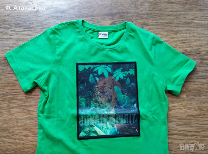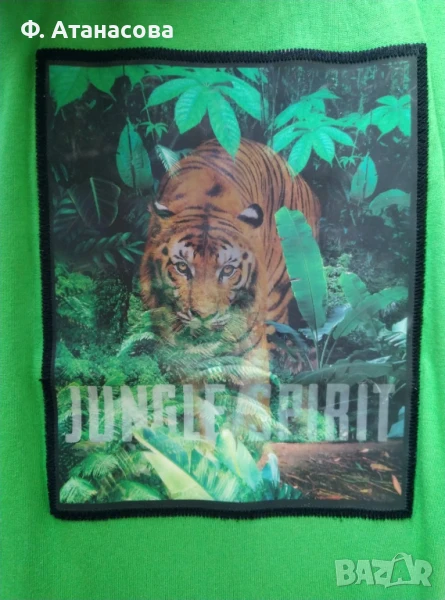 Зелена тениска с уникално красива апликация на тигър с холограмен ефект. Супер ефектна е и се харесва много на децата! Свежо зелена и от мекичка памучна материя, която не запарва.
