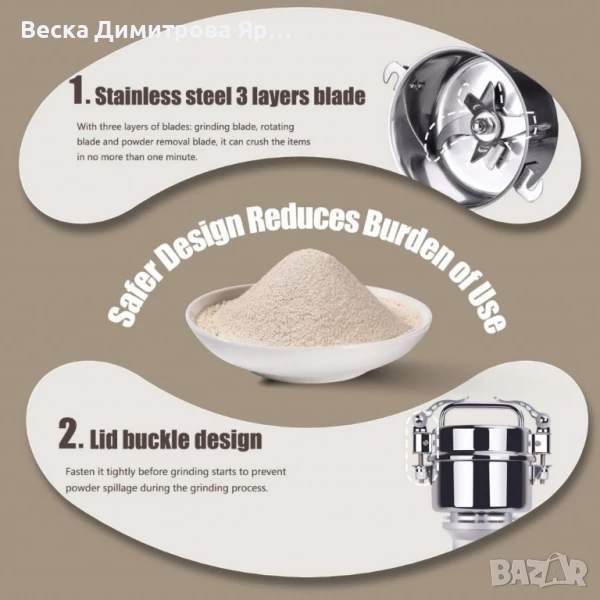 Мощна електрическа мелница за зърно и подправки – 150 г капацитет, 850W за бързо и фино смилане, снимка 1 - Други - 50799565 Мощна електрическа мелница за зърно и подправки – 150 г капацитет, 850W за бързо и фино смилане, снимка 2 - Други - 50799565 Мощна електрическа мелница за зърно и подправки – 150 г капацитет, 850W за бързо и фино смилане, снимка 3 - Други - 50799565 Мощна електрическа мелница за зърно и подправки – 150 г капацитет, 850W за бързо и фино смилане, снимка 4 - Други - 50799565 Мощна електрическа мелница за зърно и подправки – 150 г капацитет, 850W за бързо и фино смилане, снимка 5 - Други - 50799565 Мощна електрическа мелница за зърно и подправки – 150 г капацитет, 850W за бързо и фино смилане, снимка 6 - Други - 50799565 1/6