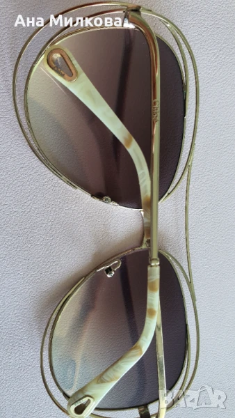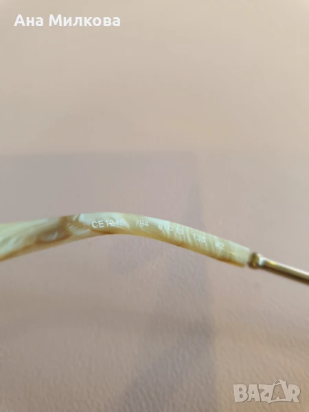 Продавам изключително стилни и елегантни слънчеви очила Chloé, модел CE 134S 794. Тези дизайнерски очила се отличават със своята уникална златиста метална рамка и красиви дръжки с мраморен ефект в бежово-кафяви нюанси.