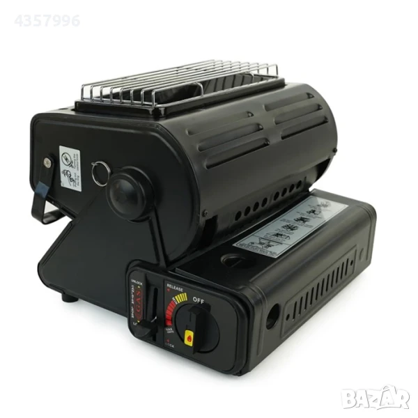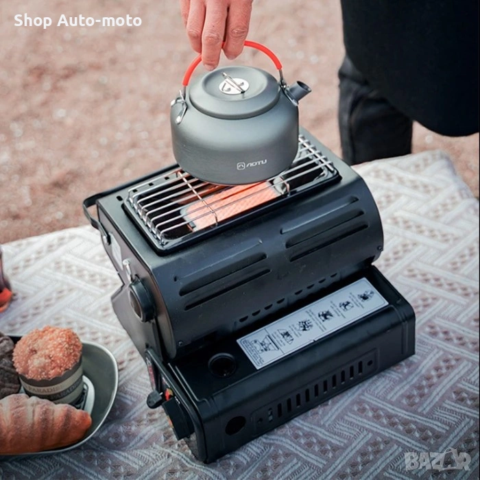 Печката работи с газови бутилки тип спрей и разполага с вградена батерия за автоматично запалване, което улеснява използването без нужда от кибрит или запалка.