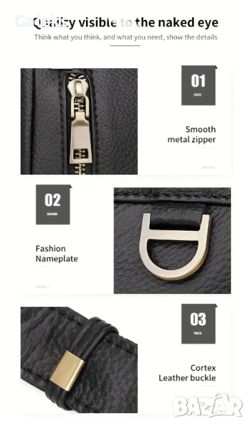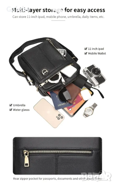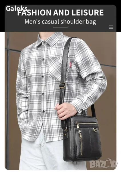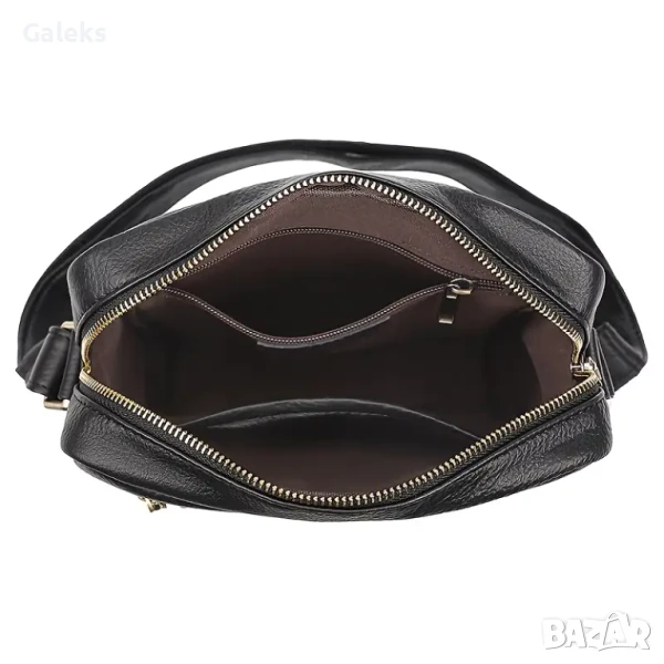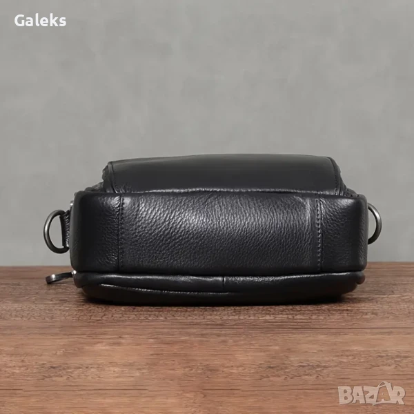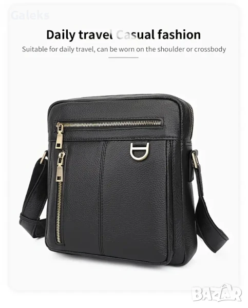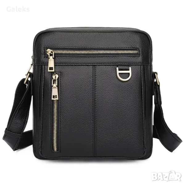 Луксозна/Мъжка универсална и просторна кожена чанта за през рамо с премиум излъчване и аристократичен стил. Дизайнерски проектирана с преливане от черната лъскава кожа към модерните златисти висулки и ципове в правоъгълен благороден дизайн.