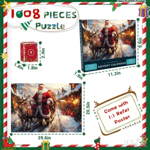 Адвент календар пъзели за деца и възрастни, 24 кутии по 1008 части коледен пъзел с Дядо Коледа, календар за обратно броене, забавна коледна игра
