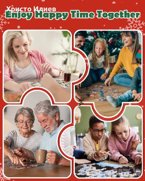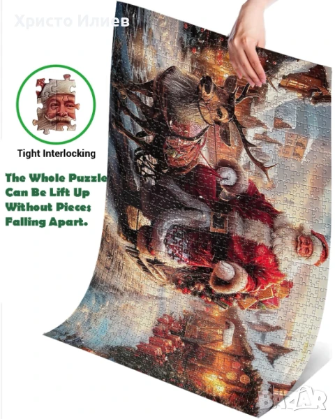 Висококачествен материал Коледният пъзел е изработен от висококачествен бял картон с ясен печат и ярки цветове. Използвана е релефна техника, без разслояване, без отлепване на хартията, не се разглобява лесно. Всяка част от пъзела е прецизно изрязана, за да се осигури идеално прилепване.
