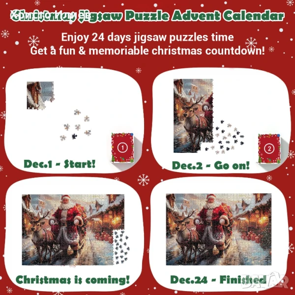 Обратното броене до Коледа е весело време на очакване и очакване. От 1 декември до 24 декември можете да попълвате парче пъзел всеки ден и да отброявате обратното броене до Коледа! Когато дойде Коледа, ще имате пълен коледен пъзел! Весела Коледа в кръга на семейството!