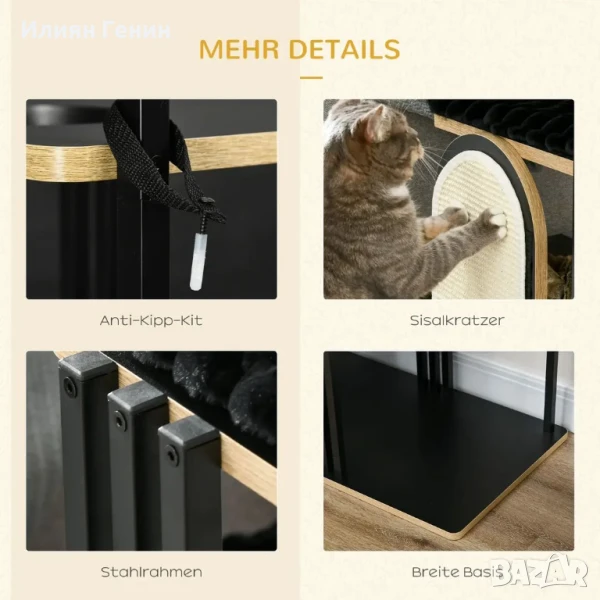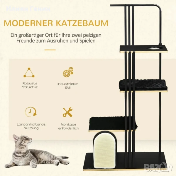 Модерен дизайн: Да, има и дървета за котки с индустриален дизайн! Взаимодействието между дърво и метал, както и изобилието от черно, добавя декоративен щрих към вашия дом.