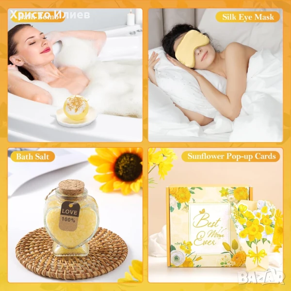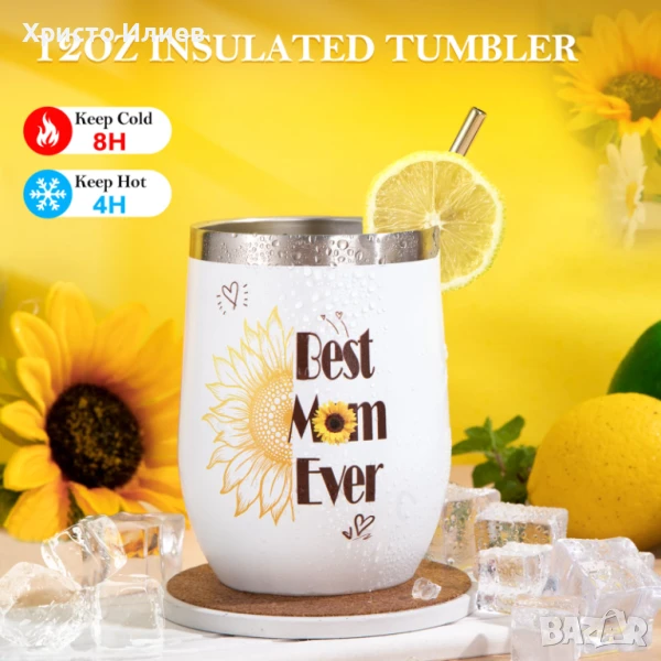 Високо качество-Тази двустенна изолирана чаша с вместимост 340 мл, изработена от висококачествена неръждаема стомана 18/8, подходяща за хранителни цели, запазва напитките топли в продължение на 4 часа и студени в продължение на 8 часа. Чашата е украсена с надпис „Най-добрата мама на света“, както и със стилен и елегантен дизайн със слънчогледи, добавяйки уникален, практичен и трогателен щрих към подаръка. Гладката копринена маска за очи осигурява нежна грижа за съня на мама, съчетавайки елегантност с практичност и подобрявайки ежедневието с нотка изтънченост.