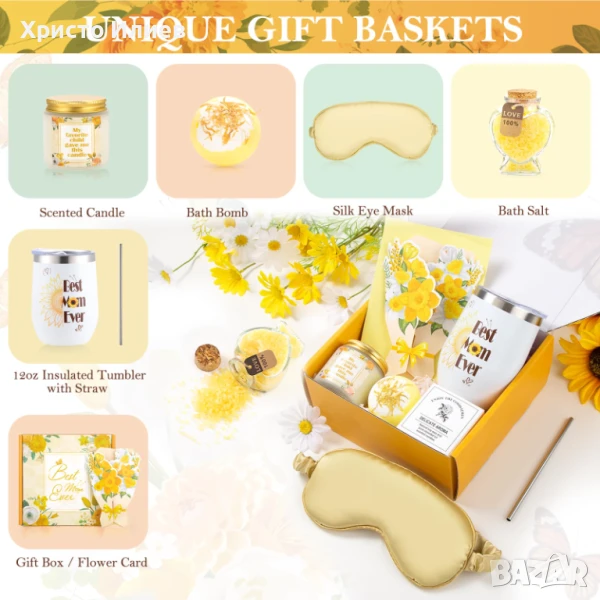 Търсите топъл и уникален подарък за вашата майка? Не търсете повече! Нашата внимателно проектирана подаръчна кутия със слънчогледи ще надмине вашето въображение и очаквания. Този подарък за мама е в ярко жълт цвят, символизиращ щастие, и съдържа 7 внимателно подбрани артикула, всеки от които носи слънце, любов и прегръдки на вашата майка! Независимо дали е нейният рожден ден, Ден на майката, Коледа или друг специален повод, този подарък за мама е отличен начин да изразите своята благодарност и любов.