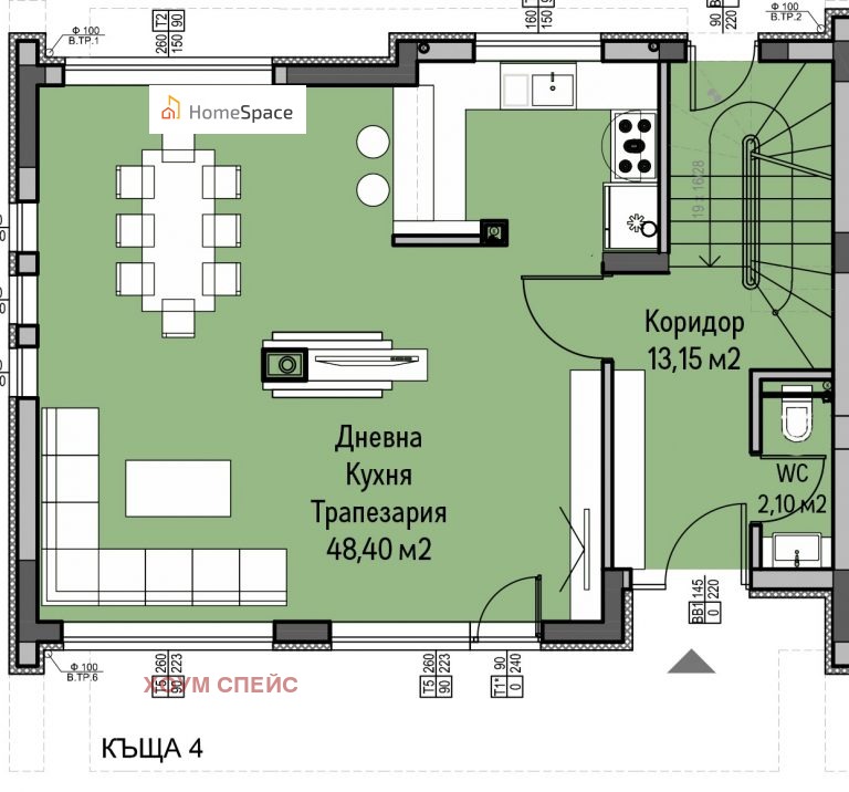 Първи етаж просторна дневна с кухненска зона, трапезария, килер, санитарен възел 76.30 кв.м