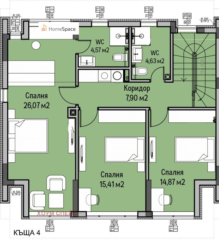 Втори етаж спални помещения, бани и тераси 98.80 кв.м
