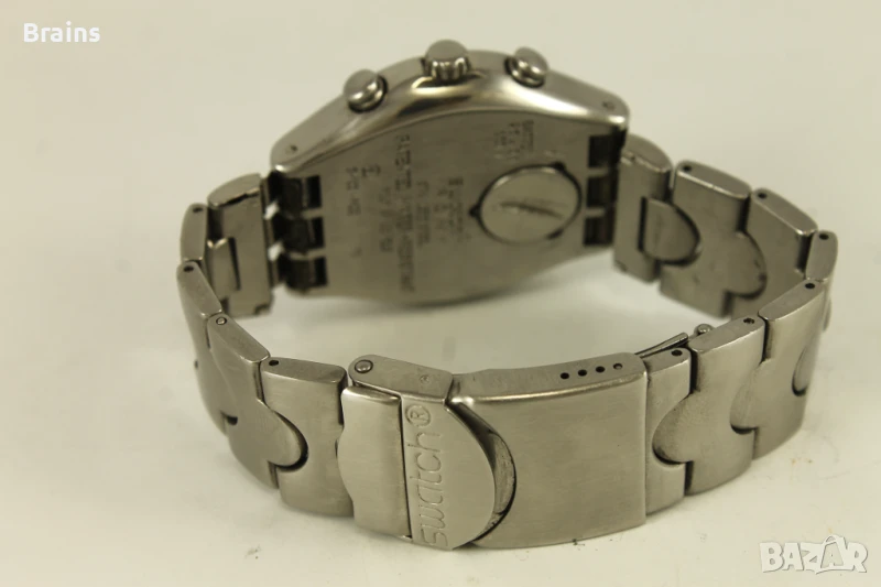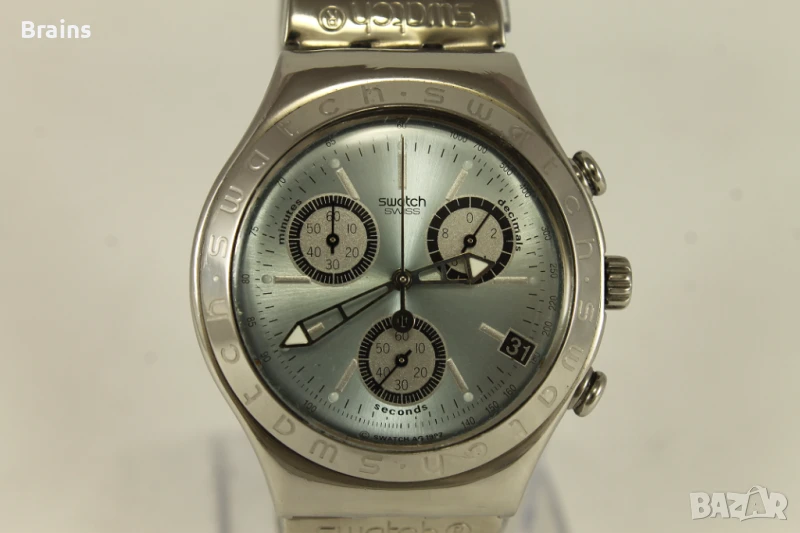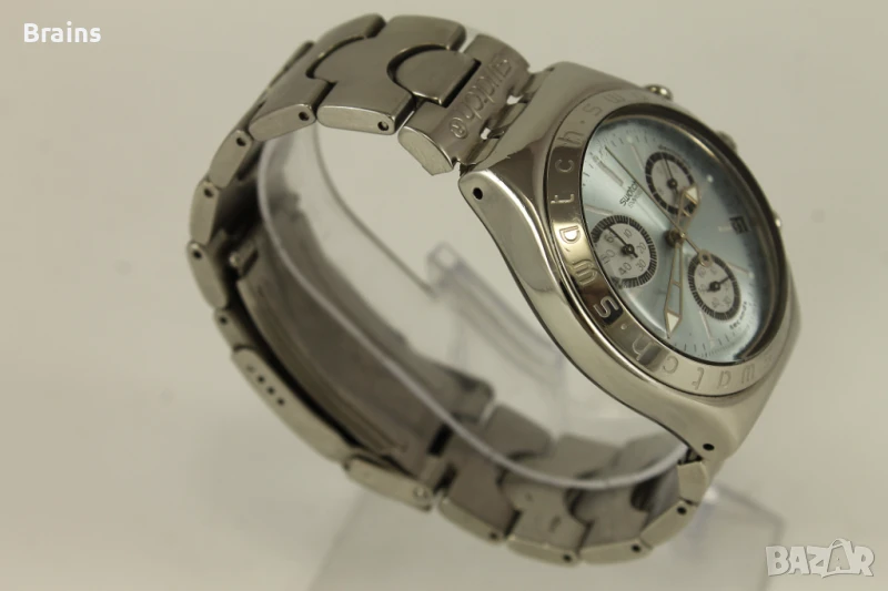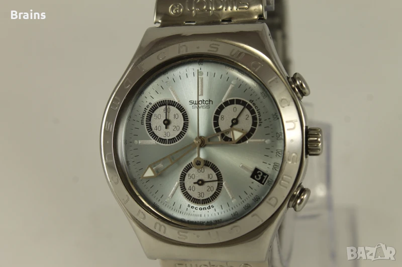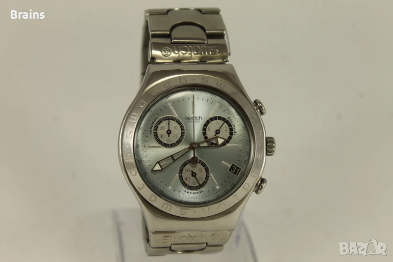Швейцарски ръчен часовник SWATCH IRONY Chronograph. Швейцарски кварцов механизъм, отлично работещ, хронографа работи, календара прехвърля. Стоманена каса и стоманена верига. Часовника е в перфектно визуално и работещо състояние. Произведен е през 1997 година.