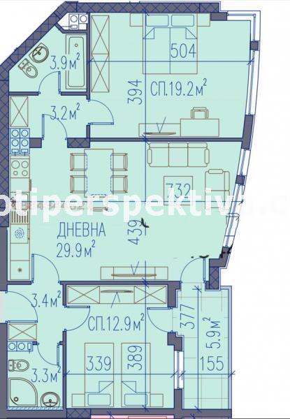 РАЗПРЕДЕЛЕНИЕ: антре, дневна с кухненски бокс, две спални, две бани с тоалетна, тераса.