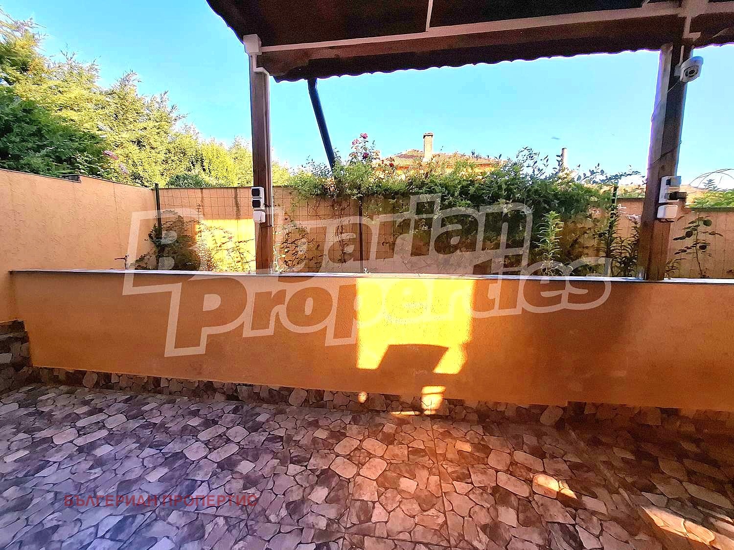 Дворът е 740 кв. м. обграден с бетонна ограда (изцяло електрифицирана) по цялата площ на имота, гараж с ролетна, автоматизирана щора, който е за два автомобила.