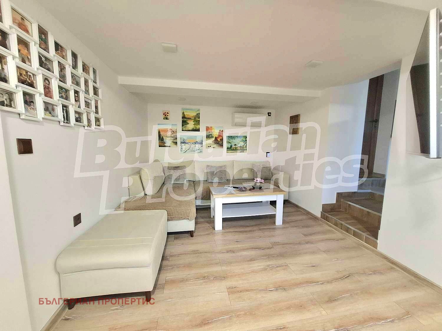 - Етаж първи - просторен хол, кухня, мокро помещение, баня с тоалетна и спалня.