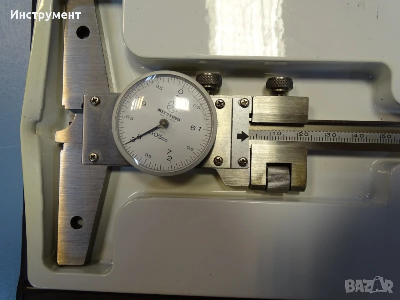 Предлагаме употребяван, в отлично състояние и запазени технически параметри, японски шублер дълбокомер с индикаторен часовник, производство на Mitutoyo.