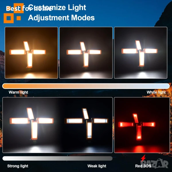 【Мощна яркост и непрекъснато затъмняване】 Строително осветление 4 x 2000 лумена максимум, можете да регулирате желаната яркост. Бяло/Топло/Естествено бяло/Червено (SOS). 4 режима на осветление могат да ви помогнат да се справите с всяка ситуация.