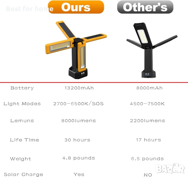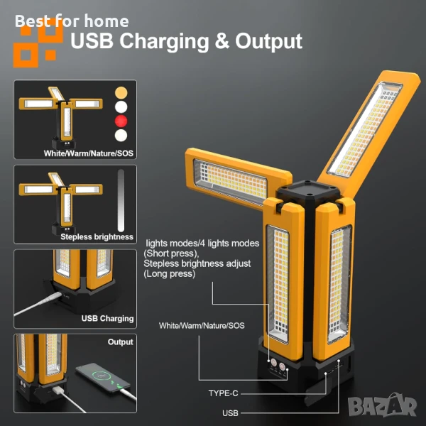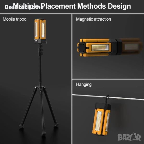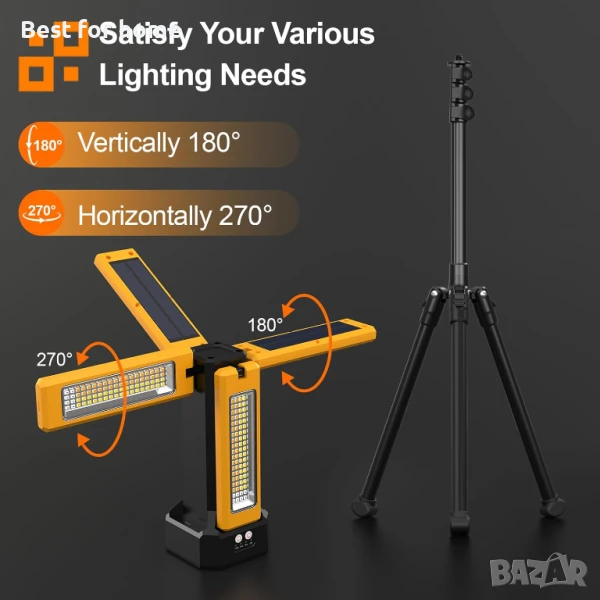【СВОБОДНО ВЪРТЯЩИ СЕ НОЖЧЕТА】Строителна лампа с четири LED глави, осигуряваща по-добро покритие на светлината. С вертикално регулиране на 180° и хоризонтално завъртане на 270°, може да освети всеки ъгъл, който пожелаете.