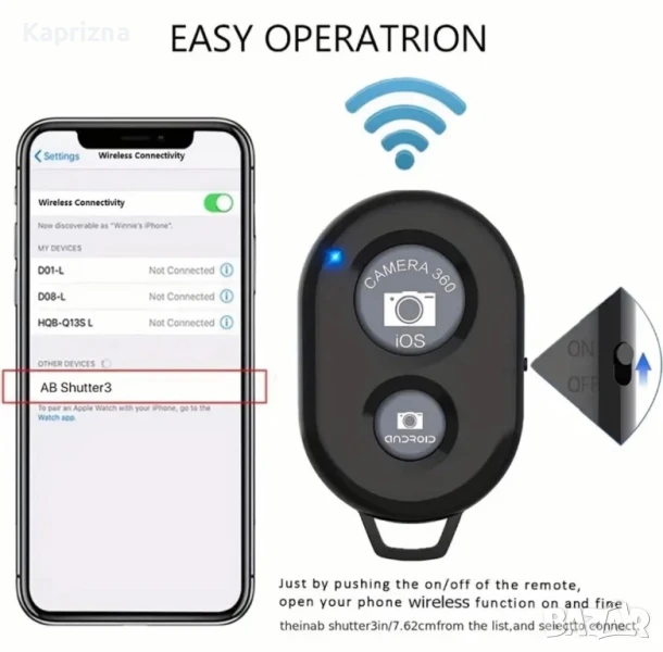 В настройките на Bluetooth на вашето устройство трябва да видите "AB Shutter3" в списъка с налични устройства. Изберете го, за да започнете процеса на сдвояване. След като се свърже, устройството ви е готово да използва дистанционното.