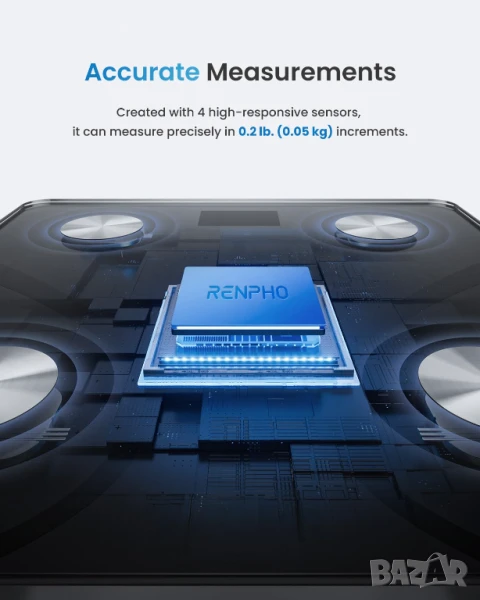 Лесно за потребителя приложение. Изтеглете Renpho Health от App Store или Google Play, работи и с Apple Watch (с изключение на Apple Watch Series 1). Приложението Renpho Health работи с Bluetooth 4.0 и по-нова версия.