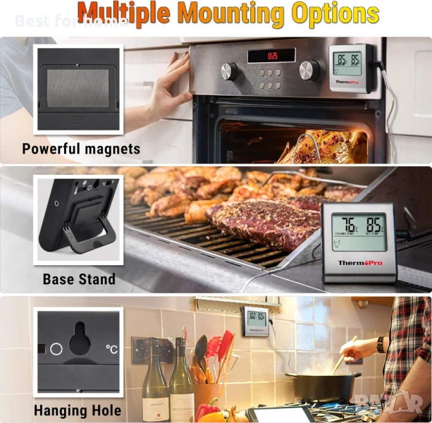 Удобно съхранение: Цифров термометър за барбекю, с магнитен гръб, който ви позволява лесно да го закрепите към хладилник или всяка метална повърхност; отвор за окачване на кухненските куки или връзка; настолна повърхност за всяка ситуация на разположение.