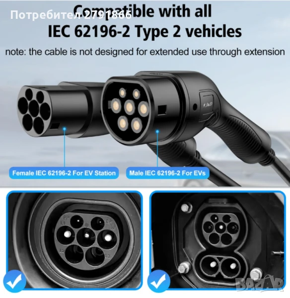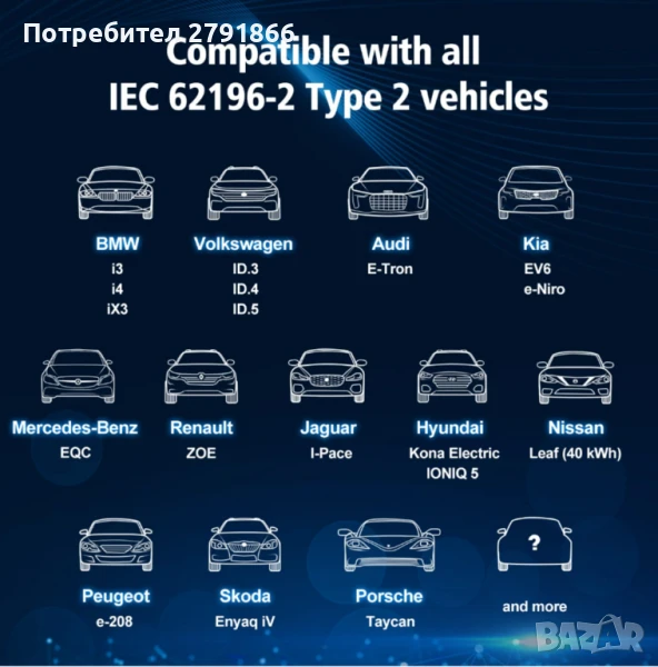 - Широка съвместимост: J&D IEC 62196-2 Type 2 към Type 2 EV кабел за зареждане работи безпроблемно с всички EV и PHEV, включително Model S/3/X/Y, i3, i4, iX3, ID.3, ID.4, ID.5, E-Tron, EV6, EQC, ZOE, I-Pace, Kona Electric, Leaf (40km) Whe), e-208, IONIQ 5, e-Niro, Enyaq iV, Taycan и други; моля, обърнете внимание, че не е подходящ за зарядни портове Type 1, CCS1, CHAdeMO и GB/T.